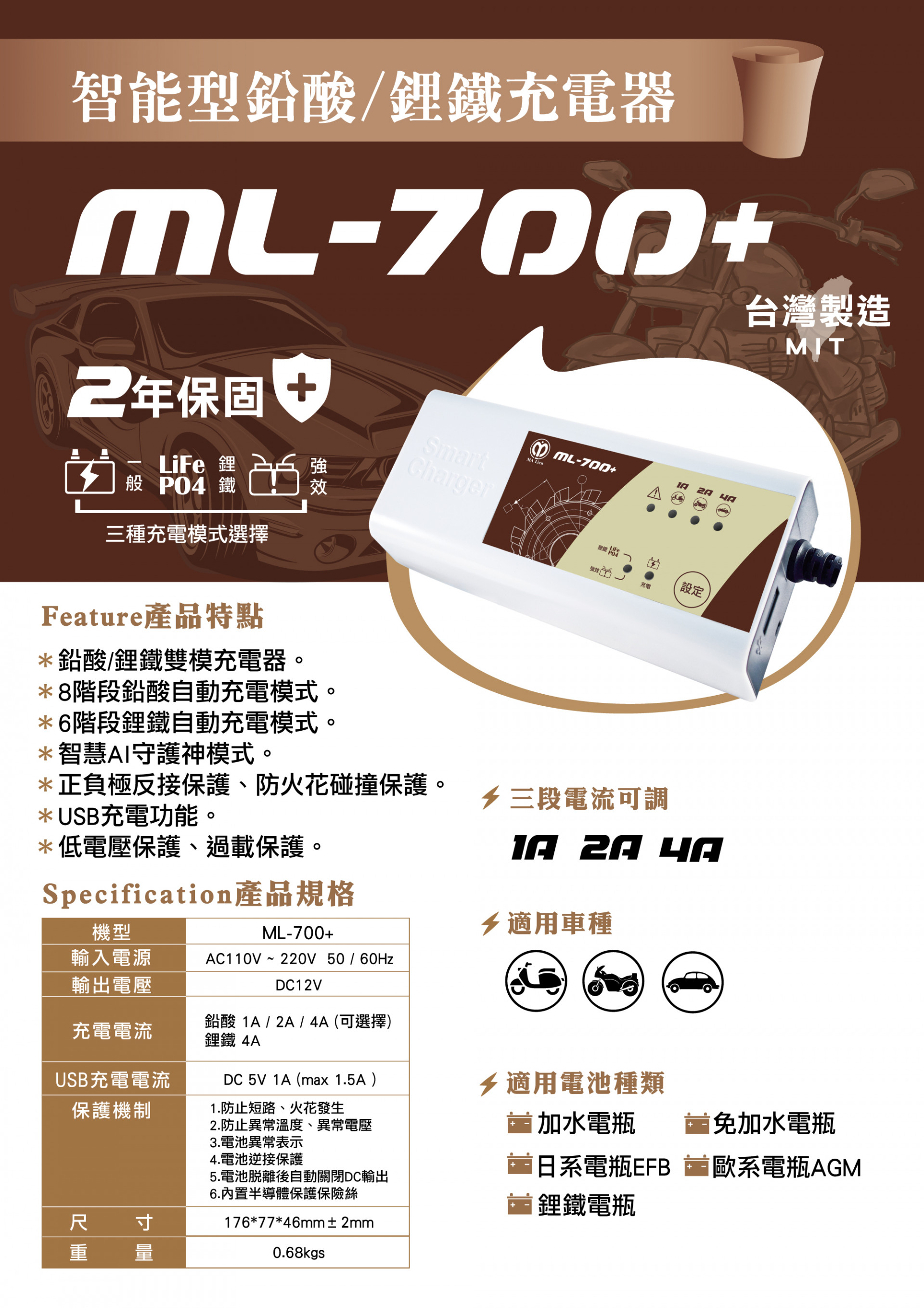 【ML-700+】智能型鉛酸/鋰鐵充電器